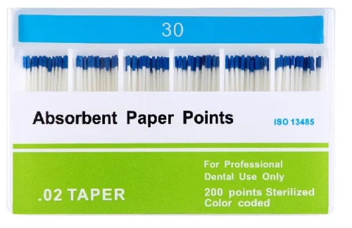 Sterile paper points 02 taper size 30 are uniformly hand-jig rolled sterilized endodontic points used in root canal therapy to remove moisture from the root canal or to introduce medication. They