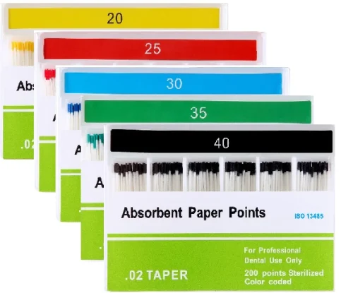 Sterile paper points 02 taper size 40 are uniformly hand-jig rolled sterilized endodontic points used in root canal therapy to remove moisture from the root canal or to introduce medication. They