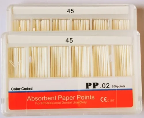 Sterile paper points 02 taper size 45 are uniformly hand-jig rolled sterilized endodontic points used in root canal therapy to remove moisture from the root canal or to introduce medication. They
